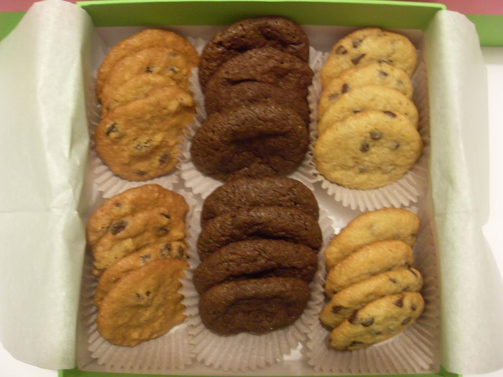 La cajita contiene 8 galletas de avena, pasas y miel, 8 galletas de chocolate y 8 galletas de chispas de chocolate.