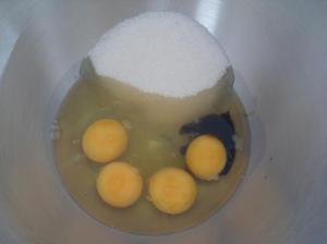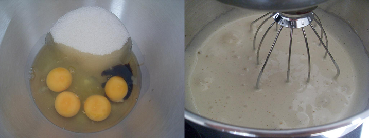 En un tazón grande batan los huevos con el azúcar y la vainilla hasta obtener punto letra o punto cinta, en castellano, hasta que espese y quede bien esponjoso, sabrán que está porque cuando levanten el batidor la masa caerá en forma de cinta y se podrá «dibujar» con ella, eso debe tomar unos 10 minutos más o menos.