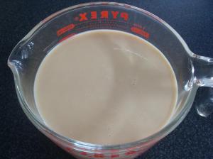 Mientras está en el horno, en un tazón mezclen las tres leches, a veces la crema de leche está un poco espesa, lo que hace que queden pequeños grumos en la mezcla, si eso sucede, pásenlo por un colador fino y descarten el sobrante. Les cuento que esta vez todas las leches que usé fueron «light», así no me da remordimiento darle una probada al postre. Ah, una sugerencia, usen un recipiente con el cual les sea fácil verter el líquido sin derramar.