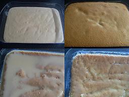 Retiran del horno el bizcochuelo y así en caliente pónganle las leches, tratando de que cubra todo el bizcocho, sobre todo los bordes, si ven que es mucha leche pues dejen que se absorba y vuelvan a poner lo que queda, no se preocupen si ven que hay  mucha leche, esta se irá absorbiendo poco a poco y el bizcochuelo irá tomando toda la humedad necesaria.