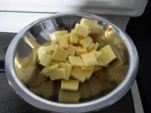 Algo importante que deben saber es que el chocolate blanco es bastante delicado, es muy importante cuidar el calor cuando se trata de derretirlo, así que lo más seguro es hacerlo a baño maría, entonces hay que poner una olla con un poco de agua al calor, dejar que el agua se caliente, pero que no hierva, poner otra olla o un tazón sobre la olla con agua cuidando de que el fondo no toque el agua, ahí poner la mantequilla y el chocolate trozado para que se derrita.