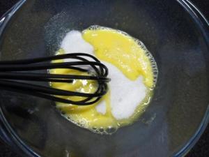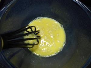 En otro tazón van a poner los huevos y mezclar con el batidor de mano, no hay que batir, sólo hay que romperlos y hacer que la yema y la clara se unan.