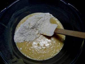 Ahora agregar harina, que debe estar cernida. Mezclar bien para que no queden bolitas de harina.