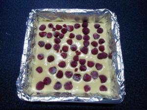Luego colocar las frambuesas sobre la masa, éstas se hundirán un poco durante la cocción pero quedarán algunos puntos rojos.