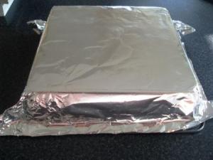 Para forrar con papel platina un molde, hago lo siguiente: corto un pedazo de platina que sea suficiente para cubrir el fondo, las paredes y para que sobresalga un poco más, volteo el molde de modo que el hueco queda abajo, pongo la platina sobre el molde y hago como si lo estuviera forrando por ese lado.