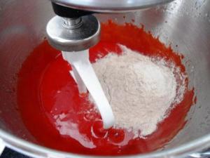 El tema con el color es más complicado, porque depende del colorante que uses, según eso se pone la cantidad. El reto más grande con los red velvet es justamente lograr la combinación adecuada de colorante para obtener el color. Con el que mejores resultados he tenido ha sido con el Super Red de AmeriColor, pero también puedes probar con el Wilton, que es el que usé en esta receta.