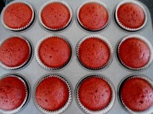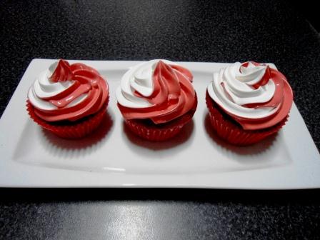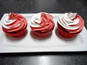 Me quedé pensando en el rojo, en el blanco, es así que decidí por los cupcakes «Red Velvet». Estos son bastante populares en el hemisferio norte, la traducción al castellano sería «Rojo Aterciopelado» pero suena raro ¿verdad? así que mejor lo dejamos con el nombre en inglés.