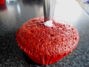 Introducen la boquilla en el medio del cupcake y presionan suavemente para que el merengue entre en el cupcake.