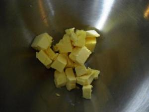 Pues bien, para hacerlos primero se debe hacer una crema con la mantequilla y el azúcar. Para que esto quede bien es importante que la mantequilla esté blanda, entonces se debe sacar del refrigerador para que tome la temperatura del ambiente. A veces el tiempo me gana y no puedo sacar a tiempo la mantequilla, cuando me pasa eso, la corto en cuadritos y la pongo unos 10 ó 15 segundos en el microondas. Eso estaba dispuesta a hacer pero adivinen qué, mi microondas murió, entonces lo que hice fue mojar con agua caliente el tazón de la batidora, luego lo sequé y puse ahí la mantequilla cortada. El tazón estaba un poco caliente, la mantequilla un poco fría, entonces la puse a batir y resultó perfecto.