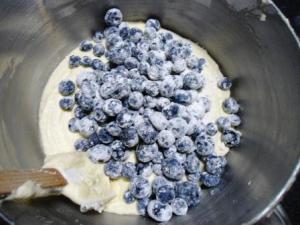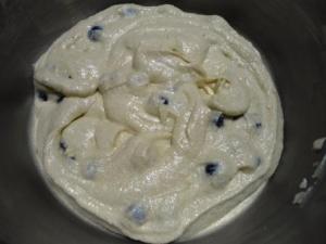 Ya fuera de la batidora, con la espátula mover la mezcla para asegurarse de que no quede harina en el fondo del tazón, luego agregar los arándanos y mover con cuidado para no romper las bayas.
