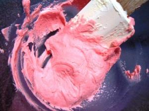 Ahora colocar en el centro la crema que quedó al natural. Usar una cuchara o espátula diferente a la que usaron para poner la roja, así evitan que se pinte la crema natural.