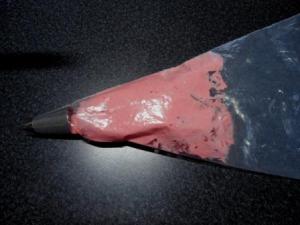 Luego abrir la manga. Verán que la crema roja ha «pintado» toda la manga, la idea es que esta crema esté al rededor de la manga.