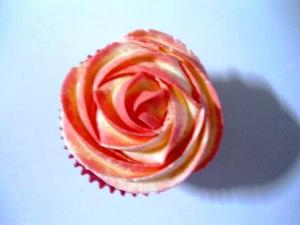 Una vez rellena la manga, proceder como siempre, es decir, doblar o enrollar la manga para que la crema baje hasta la boquilla. Pero antes de ponerse a decorar presionar la manga en un tazón hasta ver que sale la crema con los dos colores (al principio saldrá sólo la roja). Con esto listo ya pueden hacer la decoración. Primero hay que empezar por el centro, haciendo una pequeña rosa (como hacer un punto grande).