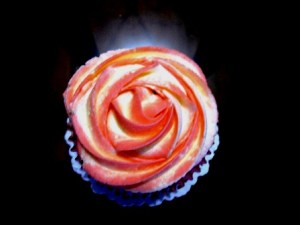 Sin dejar de presionar y sin levantar la manga, ir rodeando este centro, en otras palabras, ir decorando de adentro para afuera. Esto es totalmente inverso a lo que se acostumbra hacer cuando se hace el decorado regular de los cupcakes. Aquí sufrí un poco porque con una mano sostenía la manga y con la otra la cámara…y nadie sostenía al cupcake…!!!