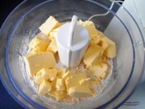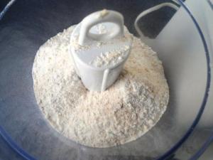 Ponen los secos en el procesador y le agregan la margarina fría cortada en cuadritos. El secreto de esta masa es que el elemento graso esté bien frío, así que saquen la margarina (o si quieren mantequilla) de la refrigeradora justo para el momento de usarla.
