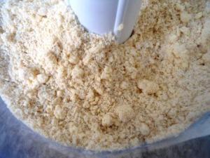Procesar hasta conseguir un arenado. Me encanta usar el procesador de alimentos, me facilita bastante la labor, pero no es imprescindible, es decir, si no lo tienen pueden usar sus manos o incluso un par de tenedores. La cosa es que logren integrar los secos con la margarina, pero no formen una masa, simplemente logren un punto como de arena o de avena.