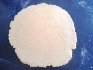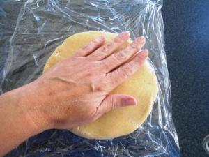 Poner film sobre la mesa, colocar una de las masas sobre éste, cubrir con film y con las manos darle forma de disco. Llevar a la refrigeradora por lo menos una hora o si quieren toda la noche. Hacer lo mismo con la otra parte de la masa.