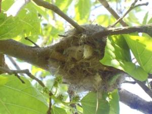 Como ya empiezan a aparecer las moras, qué mejor que ir cosechando para preparar postres con estas bayas, recién sacadas del árbol. Así que muy temprano fui a ver cómo estaba la cosecha y me encontré con algunos inquilinos que no había invitado. Un pequeño nido de pájaro, al parecer de periquito australiano, que abundan por mi zona. Eso y un pequeño caracol que en lugar de estar en tierra firme decidió aventurarse por las ramas, seguro tentado por probar el fruto fresco. Lo dejé ahí.