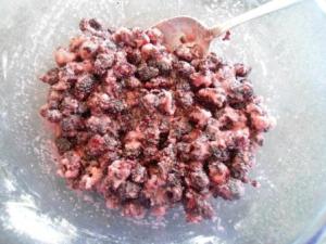 Agregar la mezcla del azúcar sobre las moras y revolver con cuidado…eso es todo.