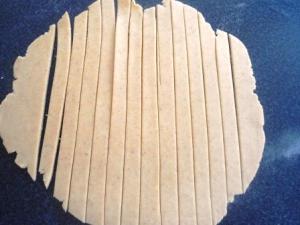 Mientras la tarta con el relleno se está refrigerando, retirar el otro disco de masa. Hacer lo mismo que con el anterior, es decir, cortar en trozos y amasar, ahí aprovechan y ponen lo que haya sobrado de masa luego de terminar de forrar el molde . Luego estirar sobre la mesa enharinada hasta lograr que tenga el tamaño de la base del molde del pie. Con un cuchillo cortar tiras procurando que tengan el mismo grosor. Pueden ayudarse con una regla o hacerlo simplemente al cálculo. Como esta es una tarta casera en verdad no es necesario que queden muy parejos.
