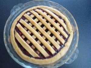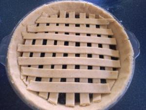 Retirar la tarta de la refrigeradora y colocar las tiras de masa de modo que se forme el enrejado. Aquí pueden optar por dos formas, colocar primero una capa de tiras y luego la segunda en forma transversal. Al final, con un cuchillo retirar los sobrantes de las tiras, nuevamente procurar no cortar la masa de los bordes.