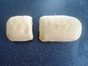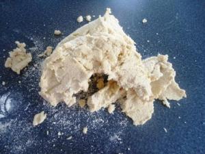 Con las manos unir la masa (no es necesario amasar), darle forma de cilindro y dividirla en dos: 2/3 de la masa será para la base de la tarta y 1/3 será para hacer el enrejado.