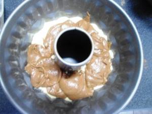 Poner otra capa de vainilla y luego poner dos o tres cucharadas de chocolate en la superficie. Pasar un cuchillo por la masa en forma de zigzag, eso hará que se mezclen ligeramente los dos sabores y es así como se consigue el efecto de los dos colores.
