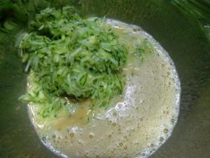 – La receta indica usar 4 onzas de zucchini (zapallito italiano, calabacín) rallado: según el convertidor, esto es como 1 taza. Siempre tengo problemas con las recetas americanas cuando me ponen las medidas en onzas, pero había un comentario de alguien que le puso 1 1/2 tazas, eso mismo hice yo.