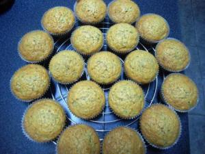 Usé 3/4 taza de azúcar y solo 2 cdtas. polvo de hornear. Le puse cranberries disecadas y nueces troceadas. Salieron 12. Deliciosos! excelente el tip de extraer el líquido al zucchini. Gracias
