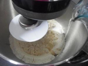 Luego agregar el agua de a pocos e ir mezclando hasta obtener una masa homogénea. Del agua que había que ponerle, me quedó en la taza como 1/4 de líquido, así que de verdad es mejor poner el agua de a pocos, no se les ocurra ponerla toda de golpe. Otra cosa, yo hice todo en la batidora, pero en verdad es para hacerlo sobre la mesa, pero bueno, a veces hay que usar las facilidades que nos da la tecnología, ¿verdad?