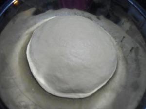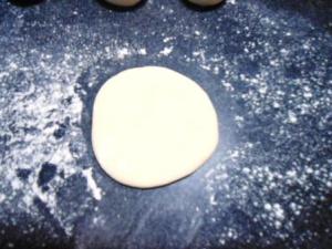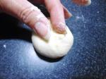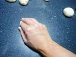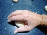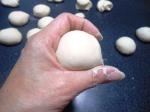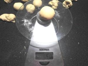 Bollar cada una de las porciones. Les explico cómo lo hice: tomé una de las porciones y la puse en mi mano, presioné ligeramente la mano de modo que la parte de arriba de la porción vaya quedando lisa. Al voltear el bollo se darán cuenta que la parte de abajo quedó toda deforme. Luego puse la parte lisa sobre la mesa y con los dedos presioné la parte de abajo del bollo para cerrar la masa. Le di vuelta al bollo de modo que la parte lisa quede arriba y la del cierre abajo. Cubrí el bollo con la mano y suavemente hice que la masa bajo mi mano gire en pequeños círculos (la mesa no debe tener harina). Con esto se obtiene un bollo liso y redondo.
