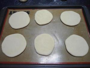 Transferir cada disco de masa a una lata. La lata puede estar sólo con harina, yo siempre le pongo el silpat, me he acostumbrado a usarlo, pero yo creo que para este caso no es necesario…no creo que en las panaderías lo usen, ¿verdad?