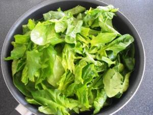 Lo primero que tienen que hacer es cortar los tallos de la espinaca y lavarla bien. No es necesario que la sequen, la sacuden un poco para retirar el exceso de agua y así la ponen en una olla para cocinarla. Con el agua que quedó de la lavada y la de las hojas verán que en un ratito se cocina.