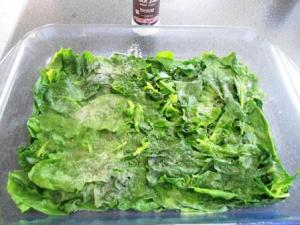 Retiran la espinaca de la olla y la ponen en un molde apto para el horno. Al molde le puse primero un poco de aceite en spray, pero pueden usar mantequilla para engrasarlo. Una vez colocada toda la espinaca, le ponen sal y un poco más del spray. Para estos casos uso sal gruesa, en verdad uso la sal rosada de Maras, me encanta.