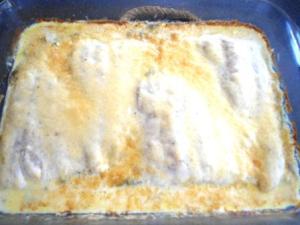 Esta crema la ponen sobre los filetes y así lo meten al horno por unos 30 minutos. El pescado se cocina muy rápido, en ese tiempo ya está listo, pero si ven que la crema no ha tomado mucho color, entonces pongan el gratinador del horno (si lo tienen) y lo dejan un rato más para que tome color. Retiran del horno y lo dejan reposar por unos minutos.
