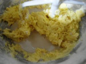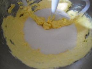 Luego de poner las claras ya batidas en otro tazón y lavar el de la batidora, se debe cremar la mantequilla con el azúcar. Batan primero la mantequilla un poco y luego pongan el azúcar. Batir por un buen rato hasta que vean que se ha puesto de un color un poco más claro. Algo que debo mencionar es que la receta dice que hay que usar «lemon sugar», es decir, azúcar saborizada con limón, pero también se puede usar azúcar común. Usé la común, me dio flojera hacer la de limón.