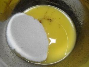 Aquí vamos. En un tazón mezclar los huevos con el aceite hasta que queden bien unidos, luego agregar el azúcar y la vainilla.