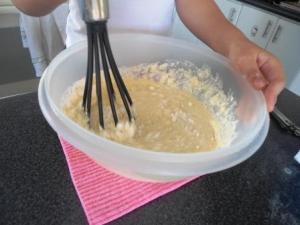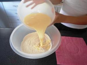 Puso carita triste, ya tenía una masa en el tazón, pero estuvo de acuerdo en que no serviría, así que la tuvimos que botar, limpiar y empezar otra vez, pero esta vez siguiendo las indicaciones de la receta.