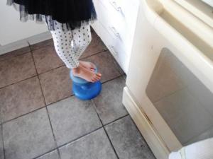 Naturalmente ella todavía está pequeña y no le es fácil alcanzar a una buena altura la cocina, entonces se paró sobre su banquito y se puso a calentar la sartén.