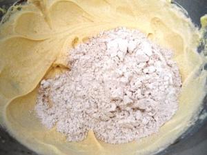 Bajar la velocidad y agregar los ingredientes secos ya cernidos, agregarlos en tres tandas, alternando con dos tandas de leche. Ojo, la receta va con una parte de «cake flour», es decir harina mezclada con fécula de maíz.