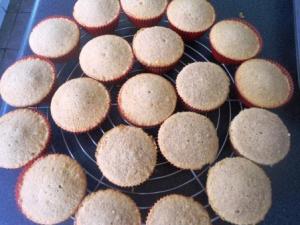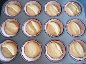 Repartir la masa en los moldes ya preparados. Saldrán como 28 cupcakes. Hornear por 20 minutos o hasta que al introducir un probador éste salga limpio.