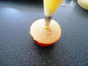 Normalmente no hago cupcakes rellenos, sólo los hice un par de veces: cuando preparé los Red Veltet para 28 de Julio (día de la independencia en Perú) y para una clase, que hice cupcakes de limón rellenos con lemon curd. Bueno, ahora serían tres.