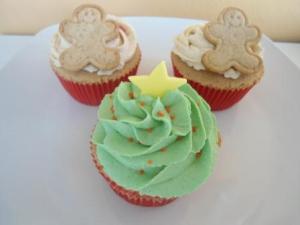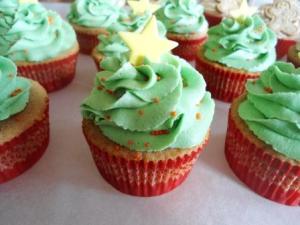 Para los otros, pinté la crema con colorante verde y les puse tres vueltas de buttercream, de modo que tengan algo más de volumen. Al final les puse unas estrellas hechas con masa elástica y unas grajeas en miniatura de colores para que queden más festivos.