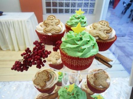 La receta para los cupcakes de canela la tomé del libro de Cupcakes de Martha Stewart, el relleno es un simple puré de manzana, que lo pueden hacer ustedes o lo pueden comprar en el supermercado, el baño lo hice con buttercream saborizado con canela y como adornos, pues a unos les puse galletitas de jengibre y a otros sólo les puse una estrella de masa elástica.
