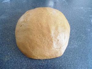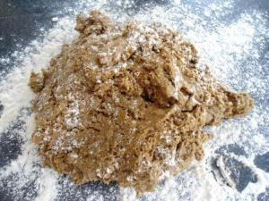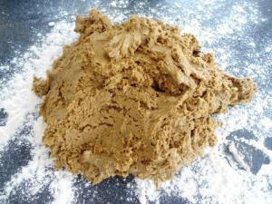 Colocar la masa sobre la mesa enharinada. Les cuento, la masa me quedó muy floja, es decir, como que le faltaba harina, no sé si se debió a que la miel de chancaca (panela) a lo mejor no es tan espesa como la melaza americana, o si es que había un error en las cantidades. La receta en el libro dice 5 1/2 tazas de harina y 1 1/2 tazas de melaza, pero después, cuando busqué la receta en internet, encontré que ahí decía 6 tazas de harina y sólo 1 taza de melaza. Entonces, les recomiendo que usen las 6 tazas de harina con la taza y 1/2 de miel.