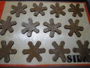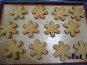 Una vez que hayan cortado las galletas las colocan en la placa para horno, la cual debe estar forrada con papel manteca o con silpat. Pero todavía no la lleven al horno, hay que ponerla nuevamente unos 15 minutos en el congelador. Dirán qué grande mi congelador si puede entrar todo eso, pues no, no entraba, así que con cuidado retiré el silpat con las galletas sobre éste y eso fue lo que puse a congelar. Como el silpat (o el papel manteca) es flexible, entonces se acomoda bien en cualquier espacio. Sí, las galletas se movieron, pero no importa, como se van a poner un poco firmes luego es fácil acomodarlas nuevamente en la placa.