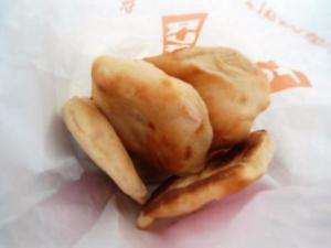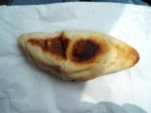 Otra cosa que ofrecen es la fugasa, que es una base de pan y sobre ésta cebolla y orégano, tampoco lo he probado. Lo que sí compré la última vez fue el sanguchito con aceituna, que es muy diferente al pan relleno con aceituna. De lo que se trata es de un sandwich de pan serrano relleno con aceituna, cebolla y ají amarillo. Si te gusta esta combinación entonces pruébalo, la cebolla no estaba muy fuerte, el ají no picaba mucho (menos mal porque no como muy picante) y la aceituna estaba firme, claro que es una aceituna entre negra y verde, mi abuelito llamaba «mulata» a ese tipo de aceituna.