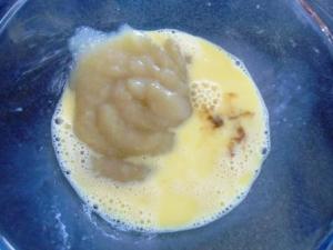 Ya, ahora sí, a la receta, en un tazón mezclar ligeramente los huevos, agregar el azúcar rubia, el puré de manzana y la vainilla y mezclar hasta integrar. La receta original indica 1 taza de azúcar blanca (o media de edulcorante y media de azúcar), pero yo le puse sólo media taza de azúcar rubia. El punto de azúcar para mi gusto quedó perfecto, pero sería cuestión de que ustedes prueben. En cuanto al puré de manzana, hay dos opciones, o lo preparan en casa o lo compran hecho. Mi recomendación es que lo hagan ustedes porque normalmente el que venden lleva azúcar. Es muy fácil, sólo tienen que pelar, picar y cocinar en una olla un par de manzanas, luego las aplastan con el tenedor y dejan enfriar. Nada complicado.