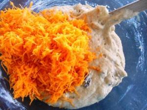 Al final agregar la zanahoria rallada. La zanahoria la lavan bien, la pelan y la rallan por el lado del rallador donde están los huecos chicos, los redondos, no lo hagan por lado que tiene forma de estrella, es más complicado. Incluso si quieren la pueden rallar por el lado del hueco grande, en ese caso la zanahoria se notará más cuando corten el queque. A mi me gusta rallar por el lado del hueco chico.