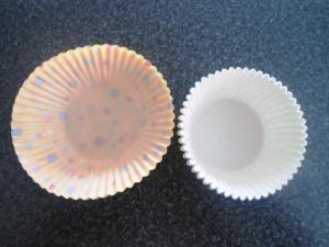 ¿Vieron cómo se hicieron al momento de poner la masa? Bueno, cuando abrí la bolsa que contenía los pirotines al ojo se veía que estaban un poco más abiertos de lo normal, pero pensé que se acomodarían al molde, por eso insistí en usarlos, pero no quedó bien, se empezaron a fruncir al momento de poner la masa, así que decidí usar los normales, los que compro en el supermercado, que no tienen color, pero por lo menos se amoldan muy bien. Igual al final los de color se pusieron transparentes.